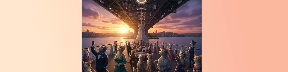 There is a silence as we pass under the bridge. Even the junior cats, who have been permitted to come up to see this exciting moment, cease their chatter. Everyone looks up. And YES, we have made it! Paws raise towards the bridge in salute.